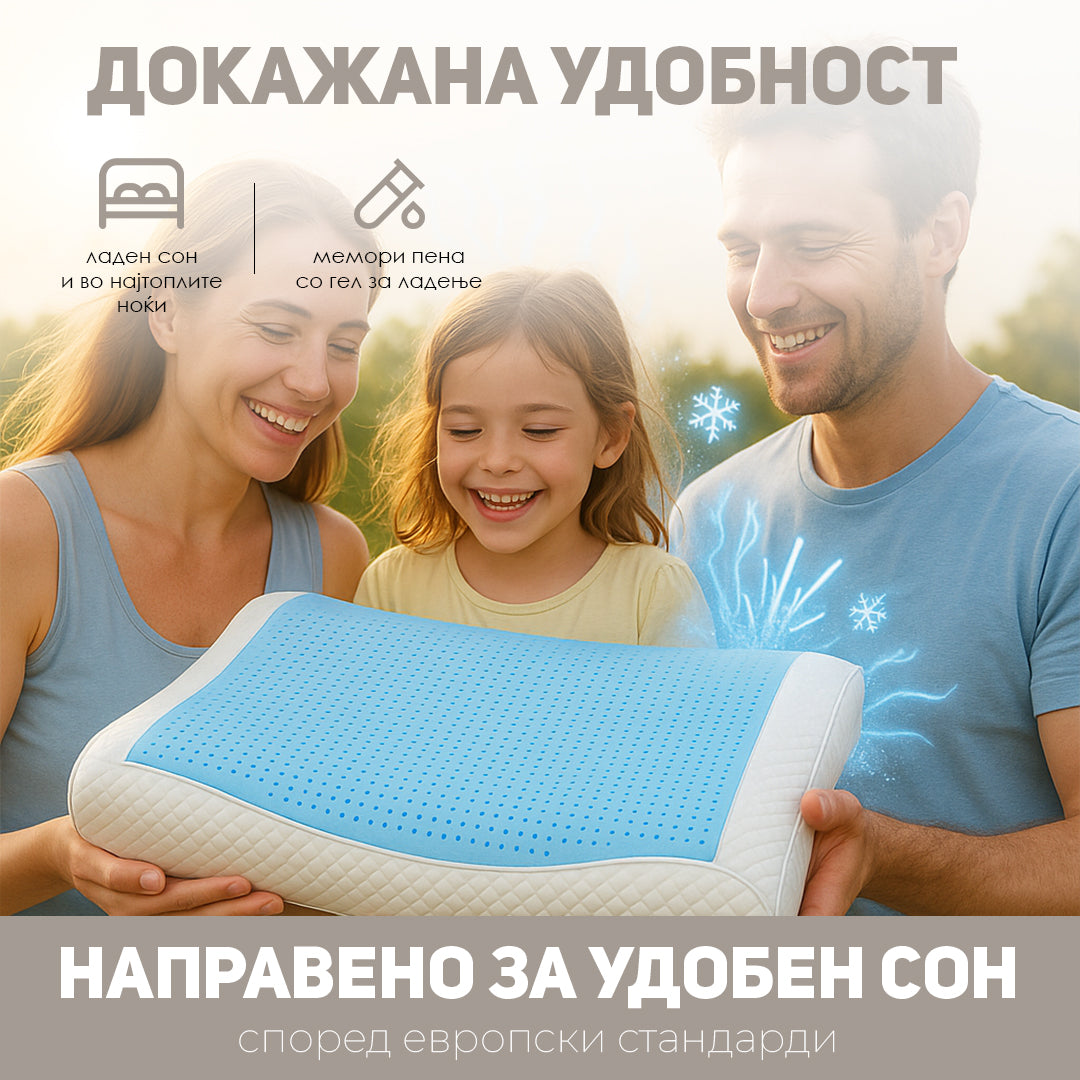 Заборави на будење со болка во вратот. Оваа перница природно ја следи формата на твојата глава и врат, и останува пријатно ладна благодарение на гелот. Комфор каков што досега не си почувствувал.